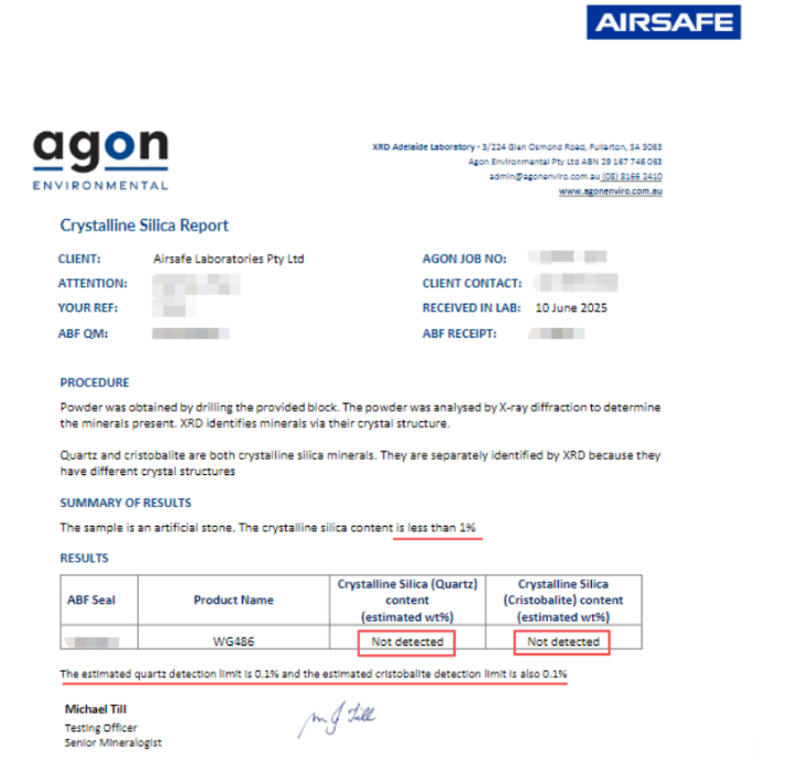إنّ كوارتز Wayon Stone الخالي من السيليكا ليس مجرد "منخفض السيليكا"، بل هو خالٍ تمامًا من السيليكا، وهو ما أكدته اختبارات مستقلة. وفقًا لتقرير اختبار مختبرات Airsafe (أستراليا)، لم يتم الكشف عن أي معادن سيليكا بلورية، بما في ذلك الكوارتز والكريستوباليت، في منتجات كوارتز Wayon Stone. يبلغ حد الكشف بتقنية حيود الأشعة السينية (XRD) في المختبر 0.1% فقط، مما يثبت أن محتوى السيليكا البلورية الفعلي أقل بكثير من معيار الرقابة الداخلية لشركة Wayon Stone البالغ ≤0.5%، وهو معيار أكثر صرامة بكثير من المستوى الصناعي الشائع البالغ ≤1%.